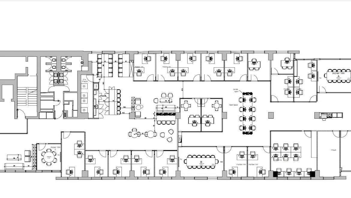אודות חלוקת המשרד: המשרד מחולק להרבה חדרי עבודה בגדלים שונים, רובם מתאימים לחדרי צוותים. יש אזורי לאונג’, מטבח גדול ומאובזר, מרפסת מגניבה! מצורפת תכנית חלוקה.