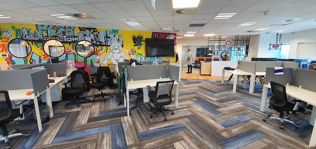 אודות חלוקת המשרד: חדר ישיבות ל 10 עובדים, 2 חדרי one on one, אופן ספייס 45 עובדים, 3 חדרים של 2 עובדים, מטבחון, חדר אוכל