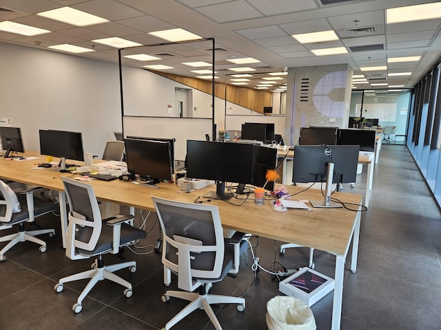 אודות חלוקת המשרד: אופן ספייס 3 עמדות , חדר ישיבות גדול , 2 חדרי צוות 3 עמדות, שרותים צמודים ומטבח משותף